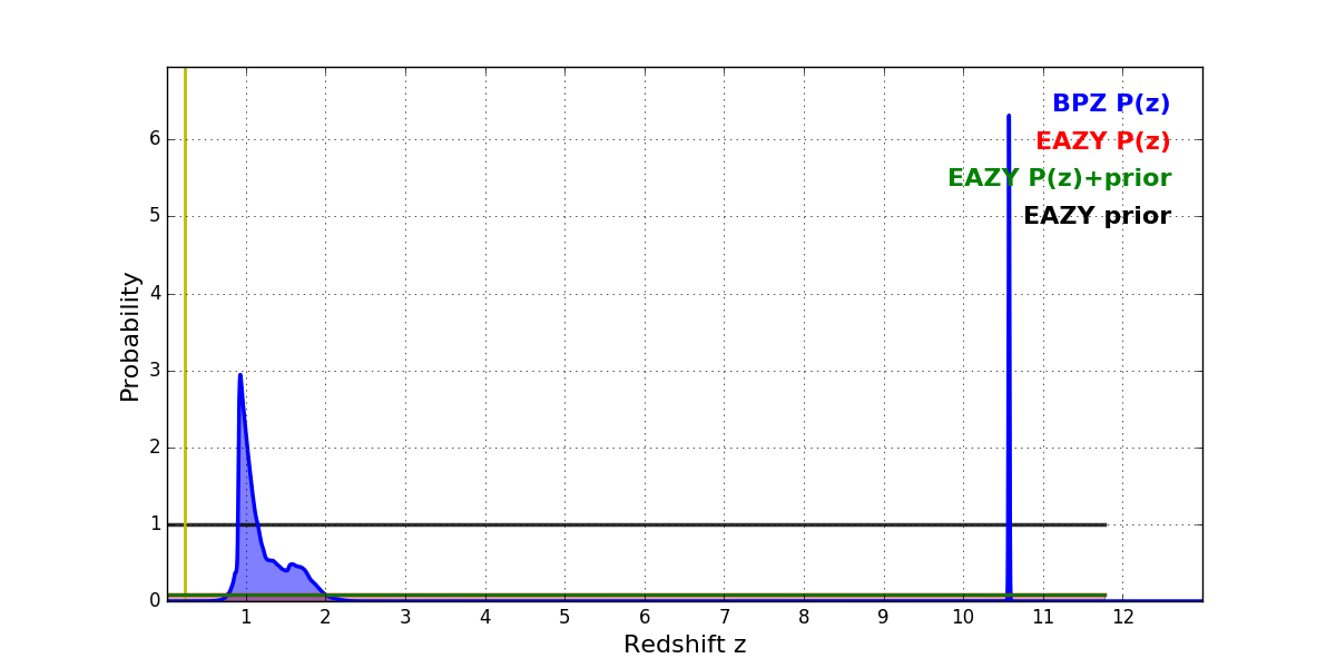 In P(z) plots: Yellow lines mark the cluster redshift z = 0.228,