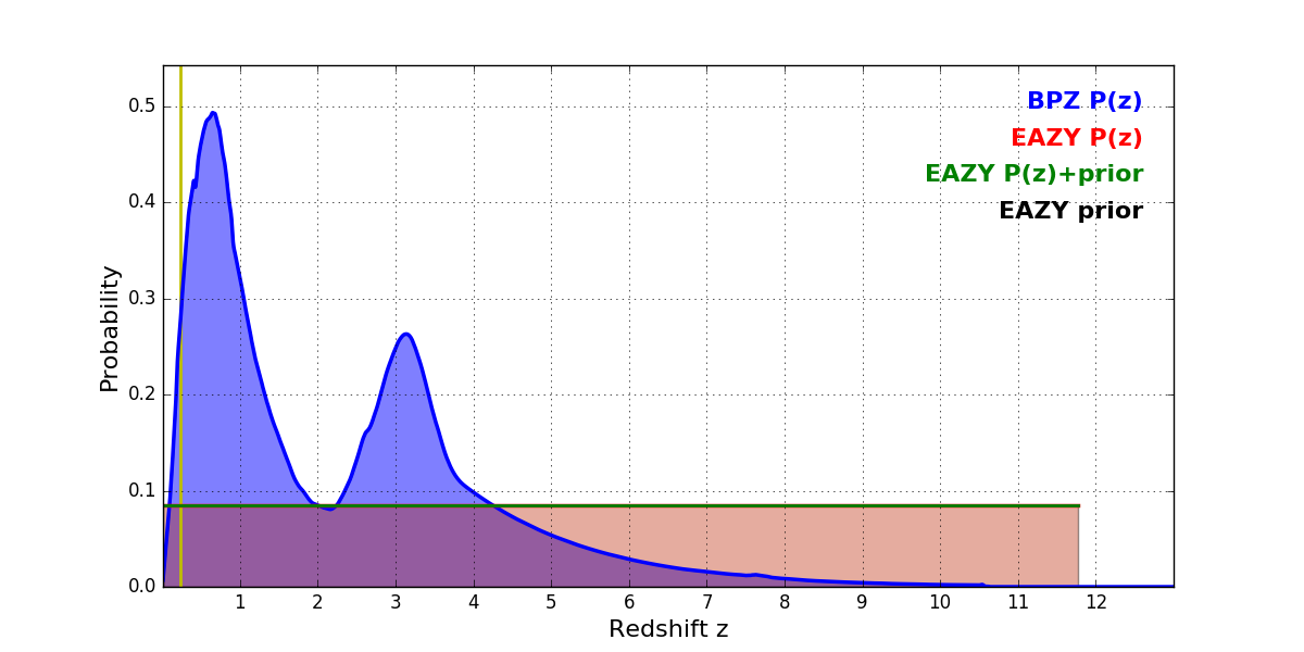 In P(z) plots: Yellow lines mark the cluster redshift z = 0.228,