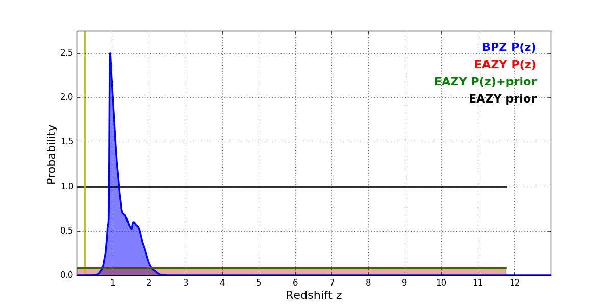 In P(z) plots: Yellow lines mark the cluster redshift z = 0.228,