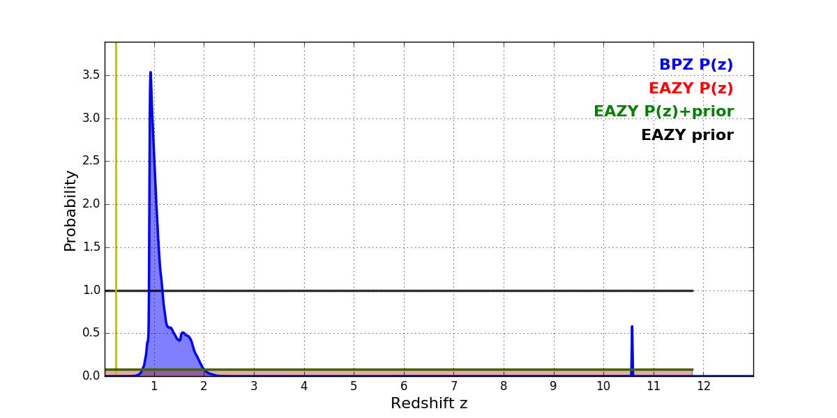 In P(z) plots: Yellow lines mark the cluster redshift z = 0.228,