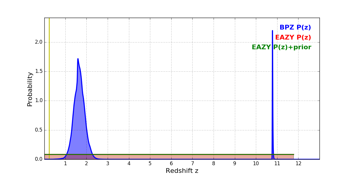 In P(z) plots: Yellow lines mark the cluster redshift z = 0.228,