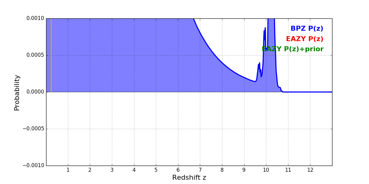 In P(z) plots: Yellow lines mark the cluster redshift z = 0.228,
