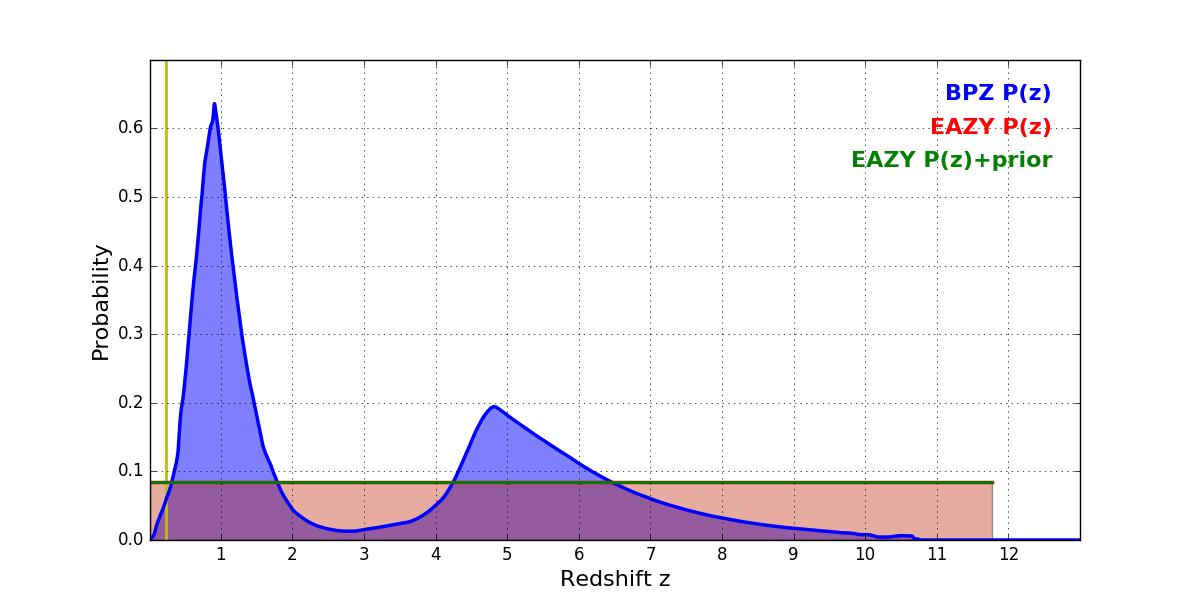 In P(z) plots: Yellow lines mark the cluster redshift z = 0.228,