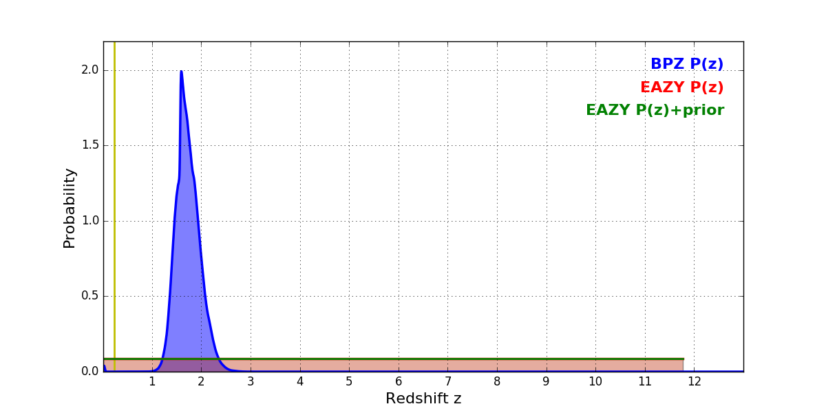 In P(z) plots: Yellow lines mark the cluster redshift z = 0.228,