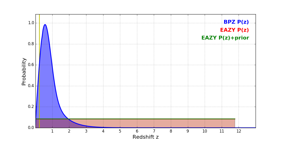 In P(z) plots: Yellow lines mark the cluster redshift z = 0.228,