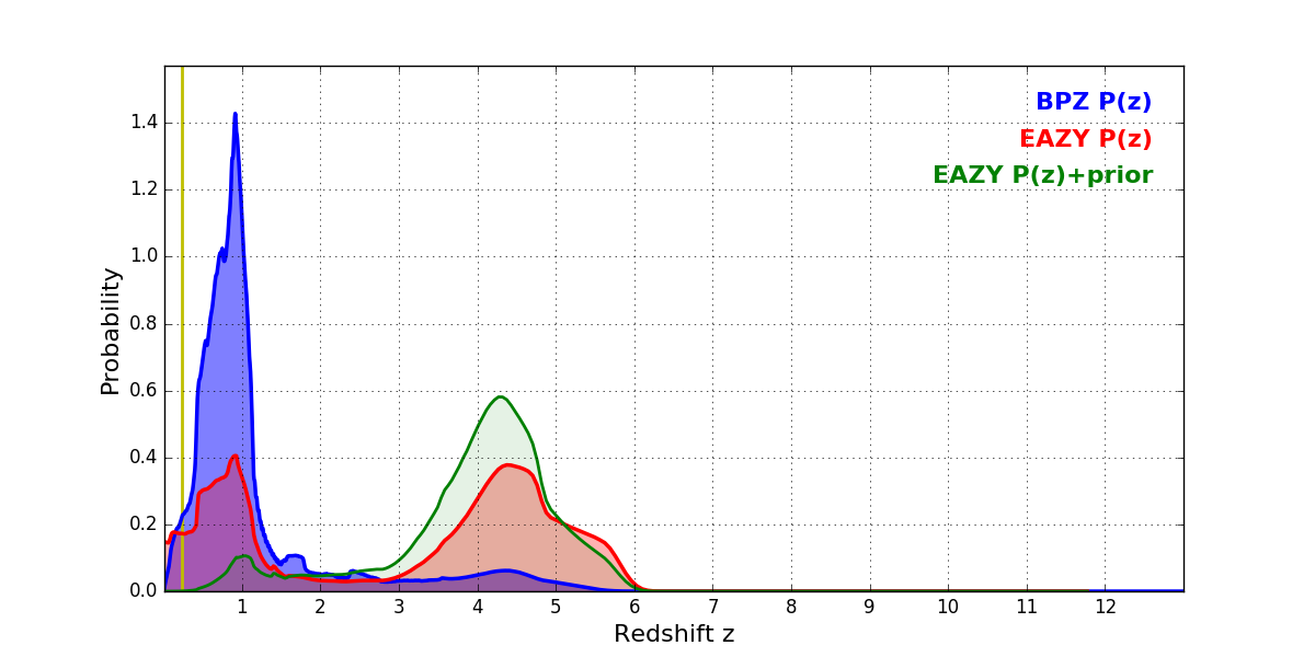 In P(z) plots: Yellow lines mark the cluster redshift z = 0.228,