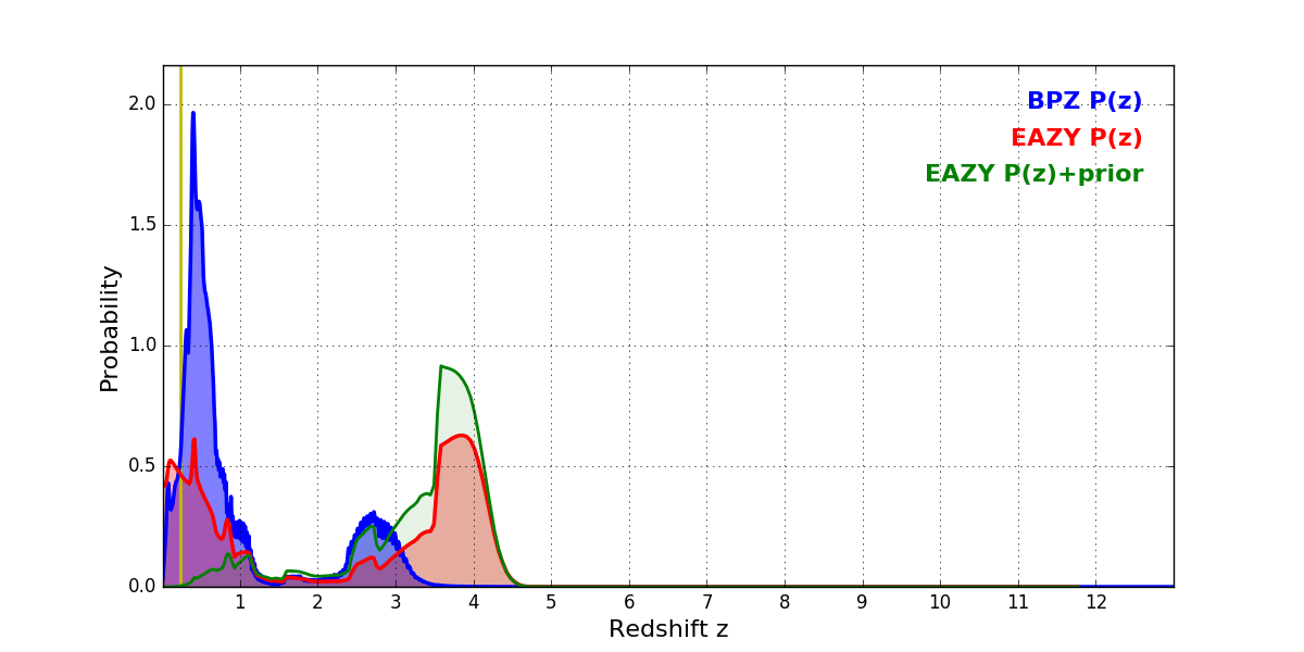 In P(z) plots: Yellow lines mark the cluster redshift z = 0.228,