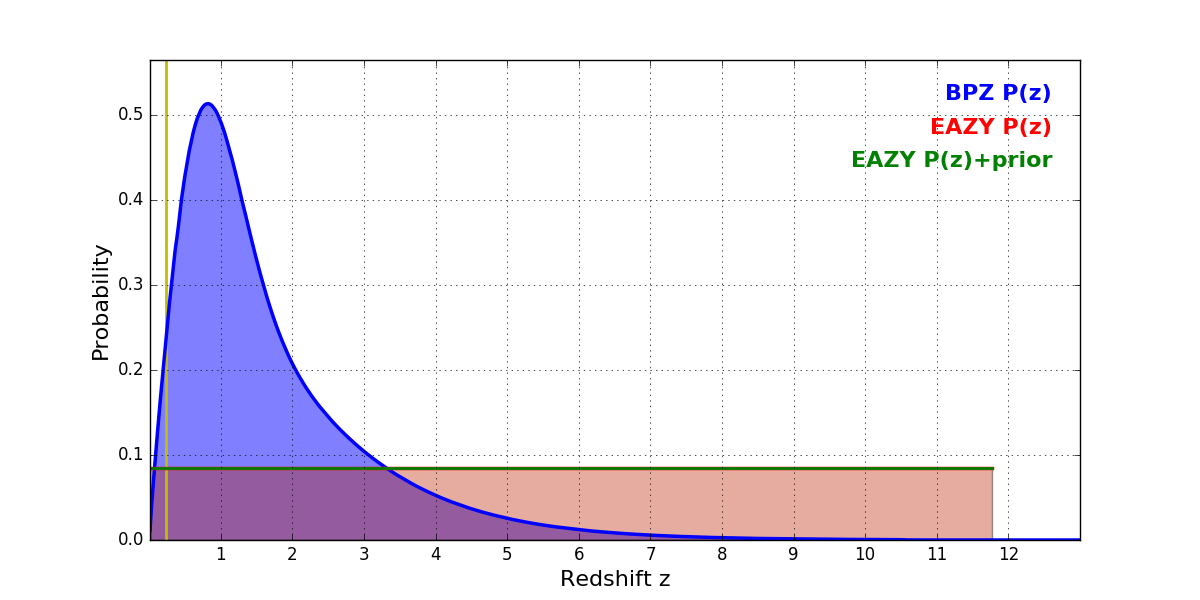 In P(z) plots: Yellow lines mark the cluster redshift z = 0.228,