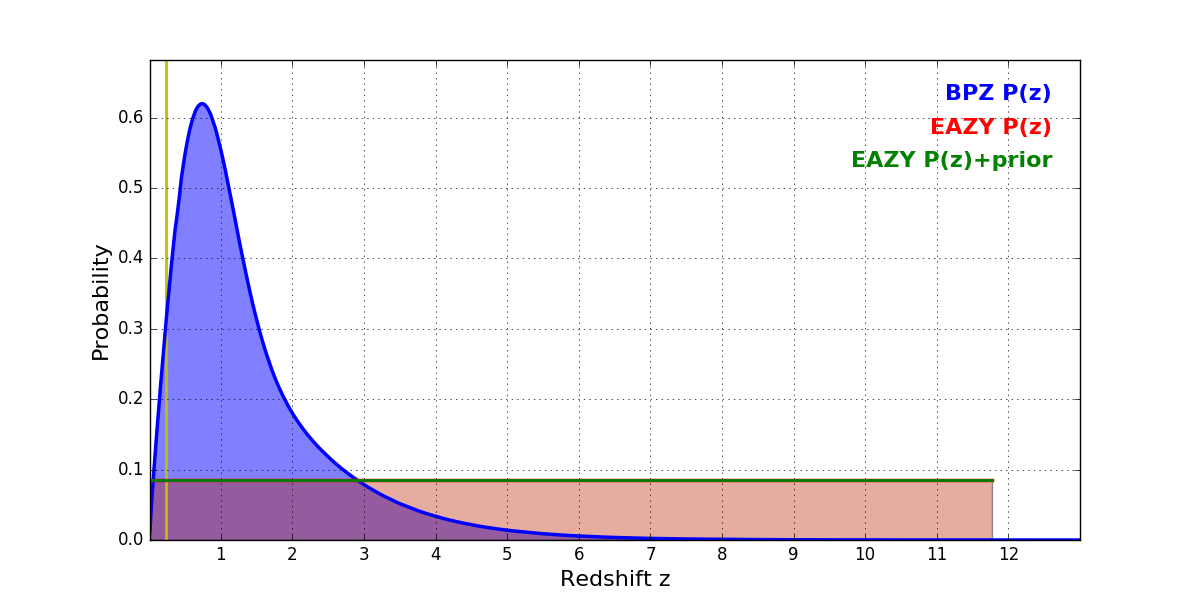 In P(z) plots: Yellow lines mark the cluster redshift z = 0.228,