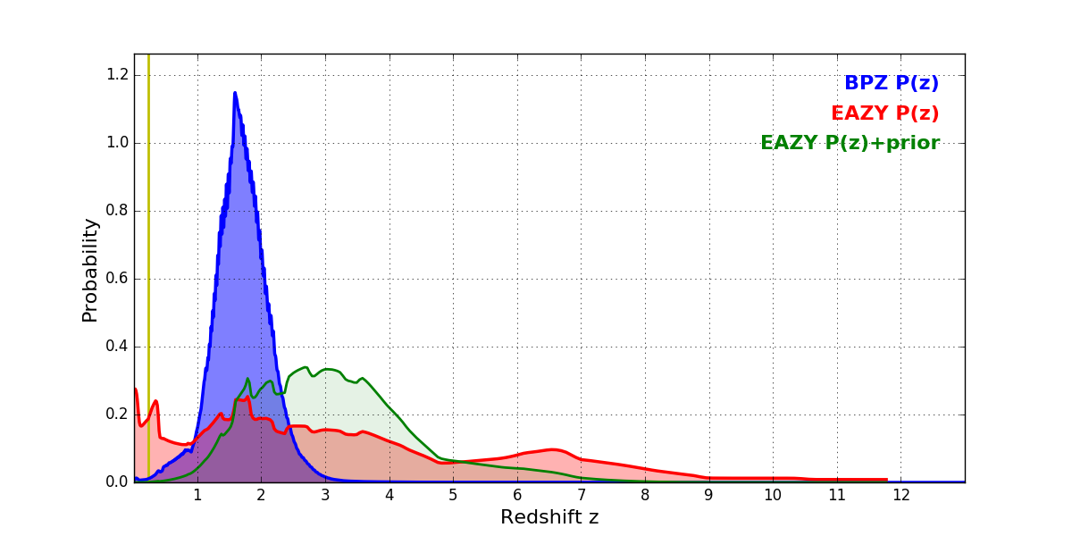 In P(z) plots: Yellow lines mark the cluster redshift z = 0.228,