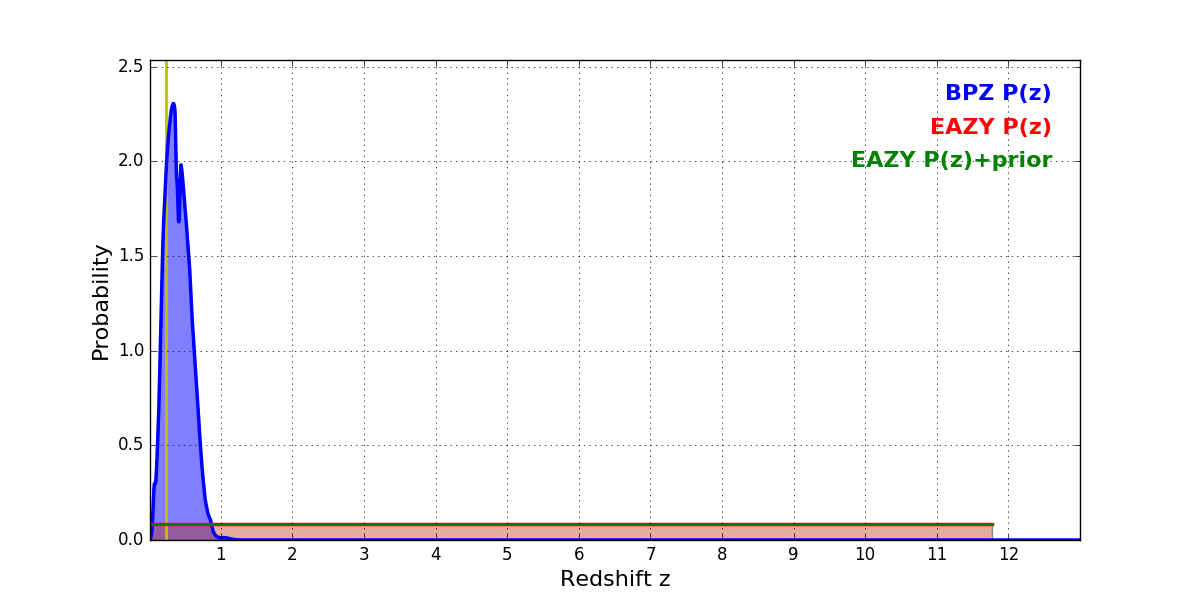 In P(z) plots: Yellow lines mark the cluster redshift z = 0.228,