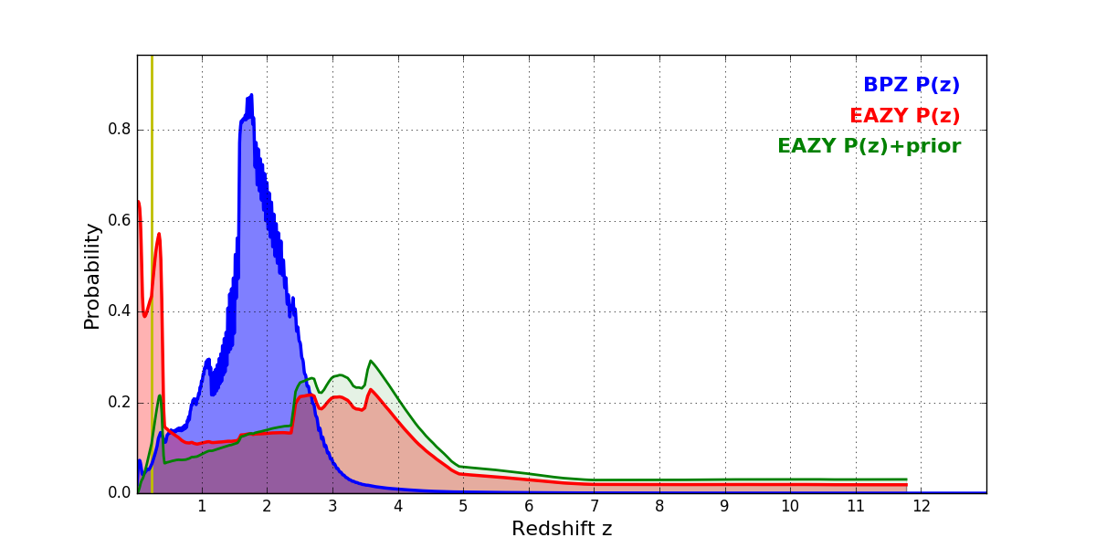 In P(z) plots: Yellow lines mark the cluster redshift z = 0.228,
