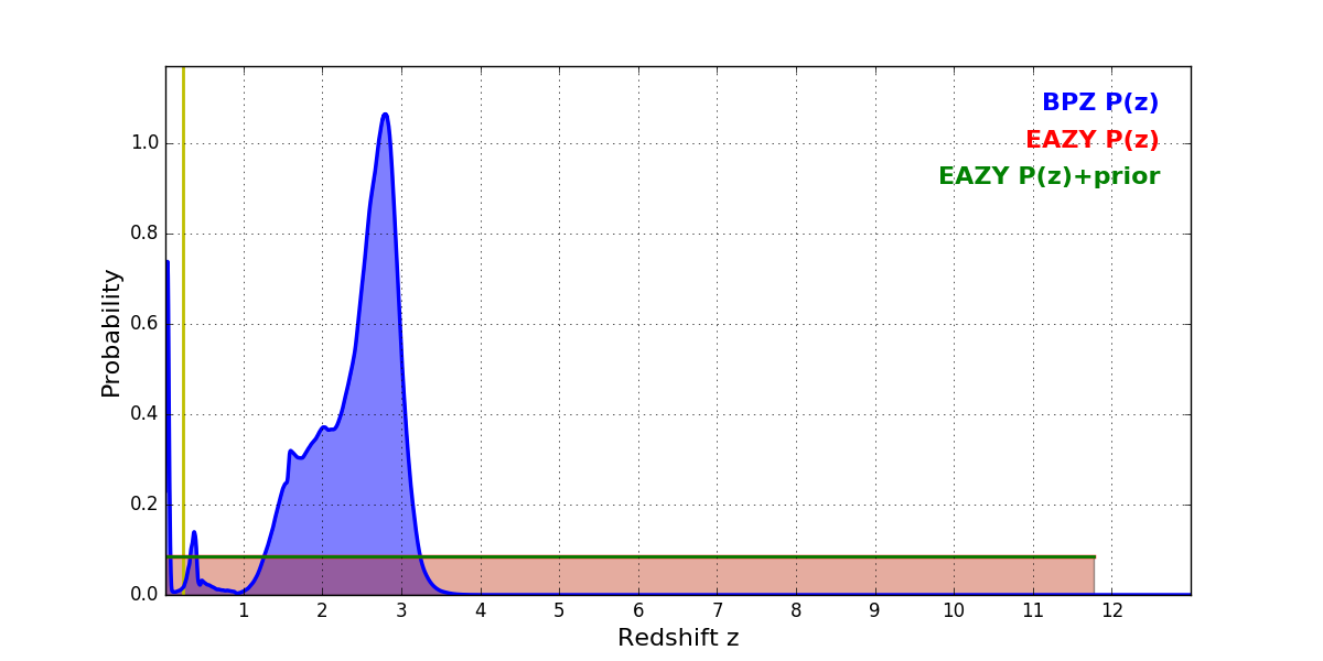 In P(z) plots: Yellow lines mark the cluster redshift z = 0.228,