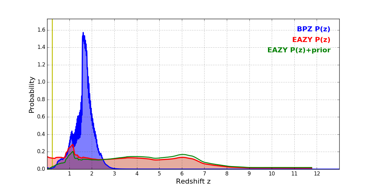 In P(z) plots: Yellow lines mark the cluster redshift z = 0.228,