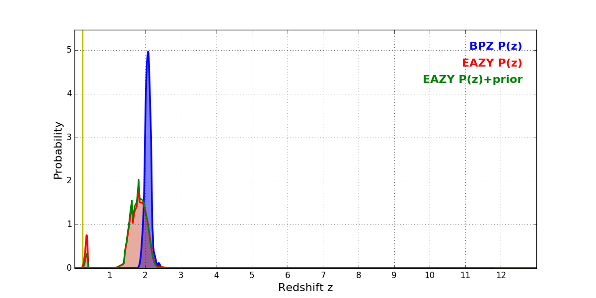 In P(z) plots: Yellow lines mark the cluster redshift z = 0.228,
