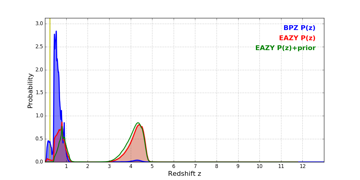 In P(z) plots: Yellow lines mark the cluster redshift z = 0.228,