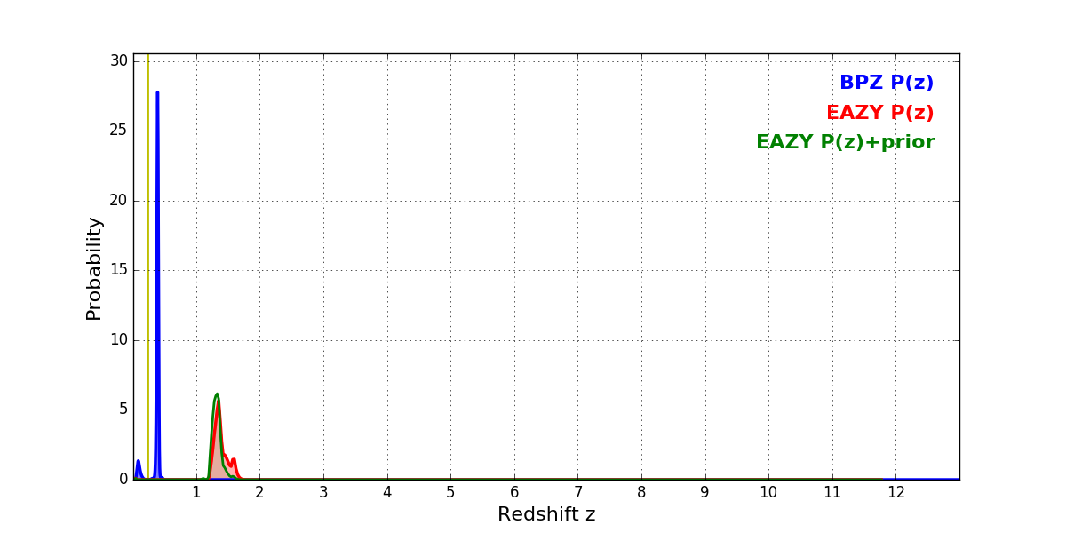 In P(z) plots: Yellow lines mark the cluster redshift z = 0.228,