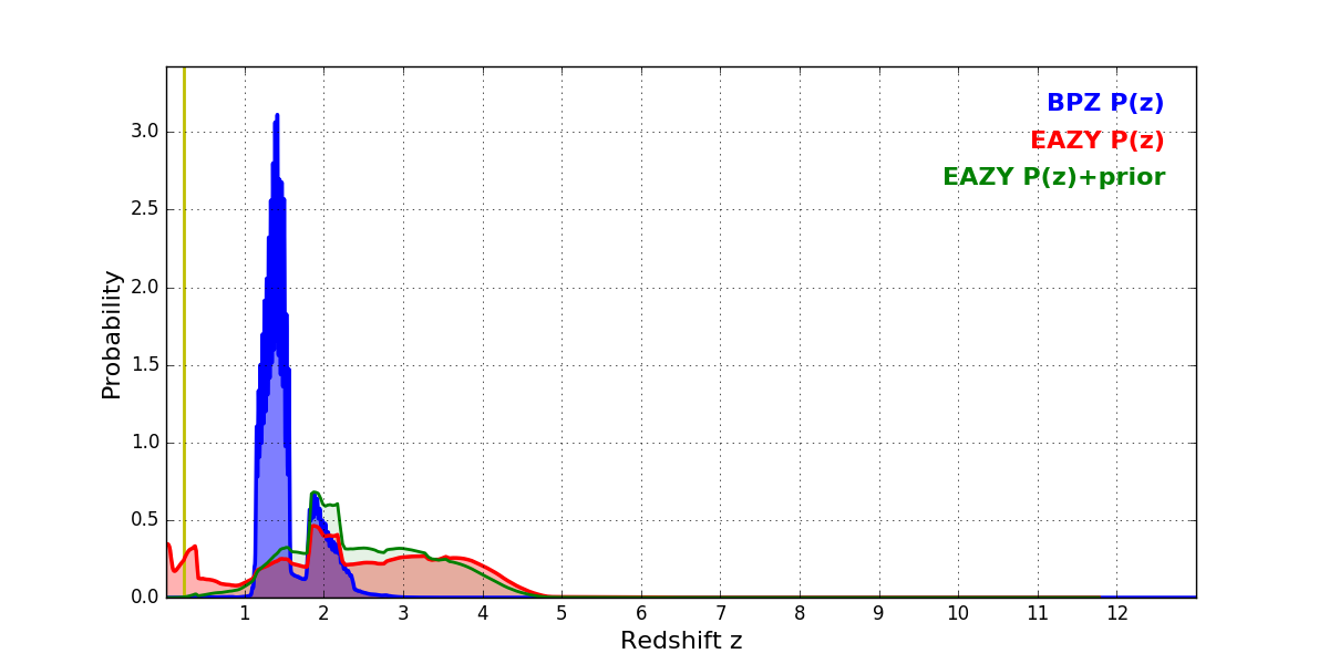 In P(z) plots: Yellow lines mark the cluster redshift z = 0.228,