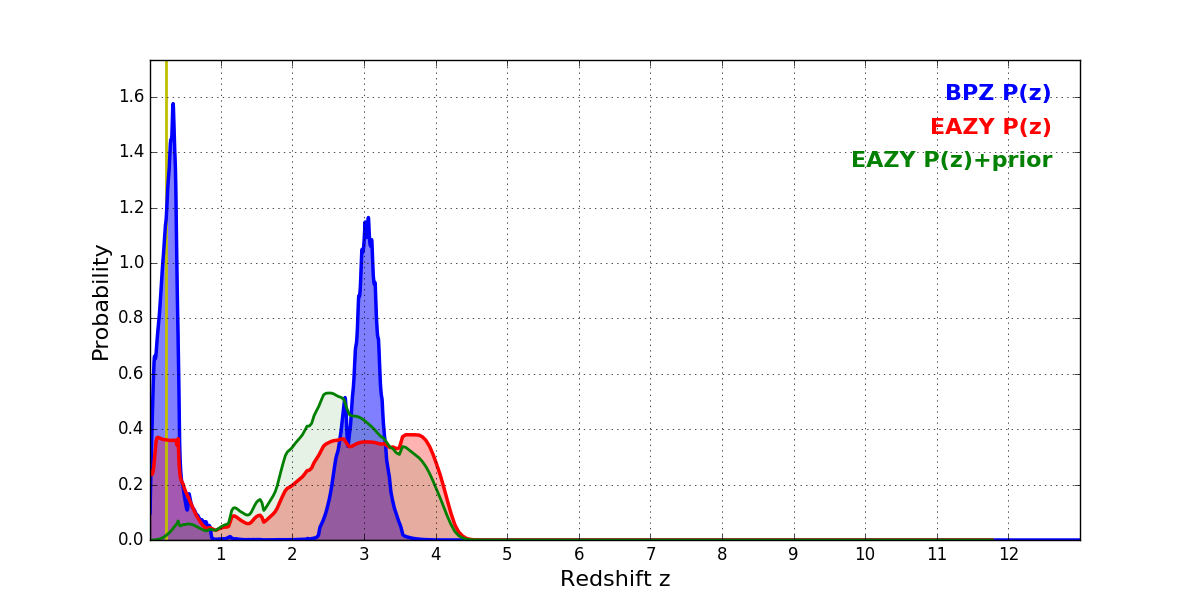 In P(z) plots: Yellow lines mark the cluster redshift z = 0.228,