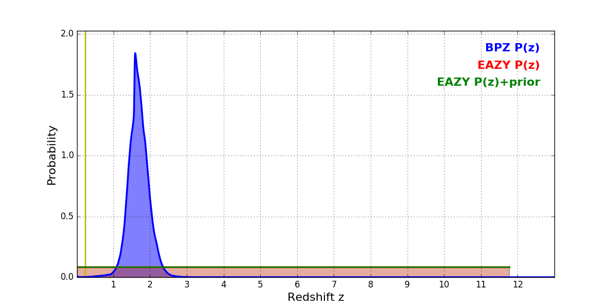 In P(z) plots: Yellow lines mark the cluster redshift z = 0.228,