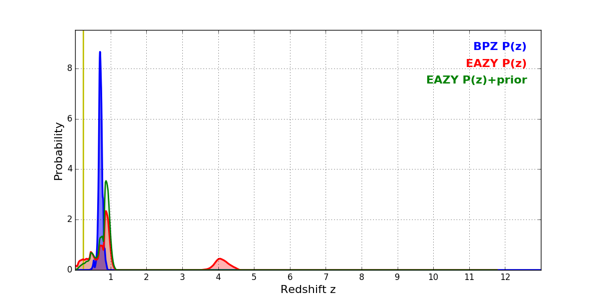 In P(z) plots: Yellow lines mark the cluster redshift z = 0.228,