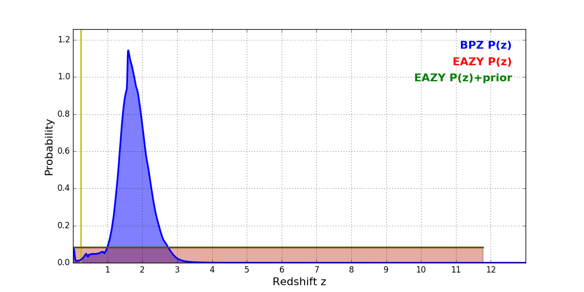 In P(z) plots: Yellow lines mark the cluster redshift z = 0.228,