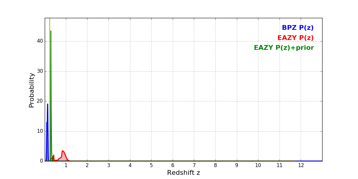 In P(z) plots: Yellow lines mark the cluster redshift z = 0.228,