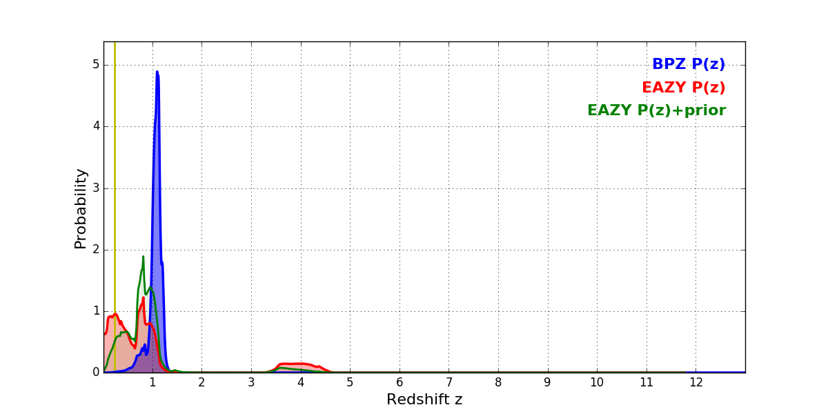 In P(z) plots: Yellow lines mark the cluster redshift z = 0.228,