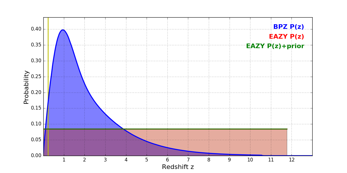 In P(z) plots: Yellow lines mark the cluster redshift z = 0.228,