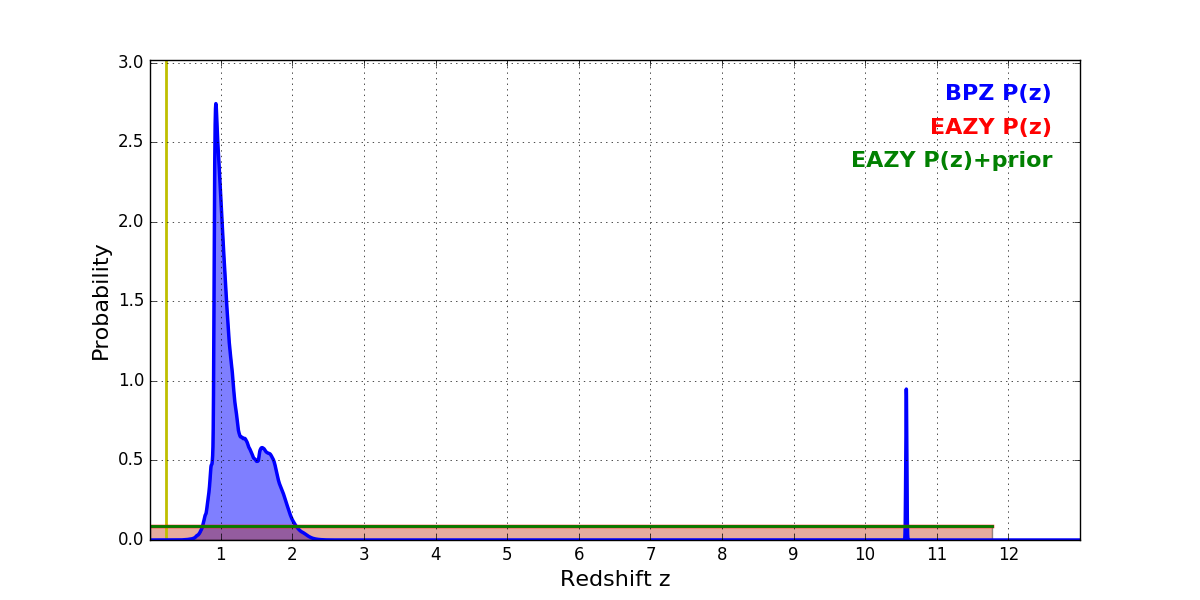 In P(z) plots: Yellow lines mark the cluster redshift z = 0.228,