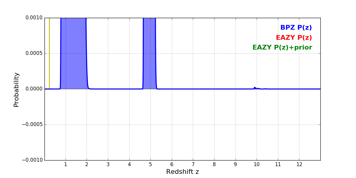 In P(z) plots: Yellow lines mark the cluster redshift z = 0.228,