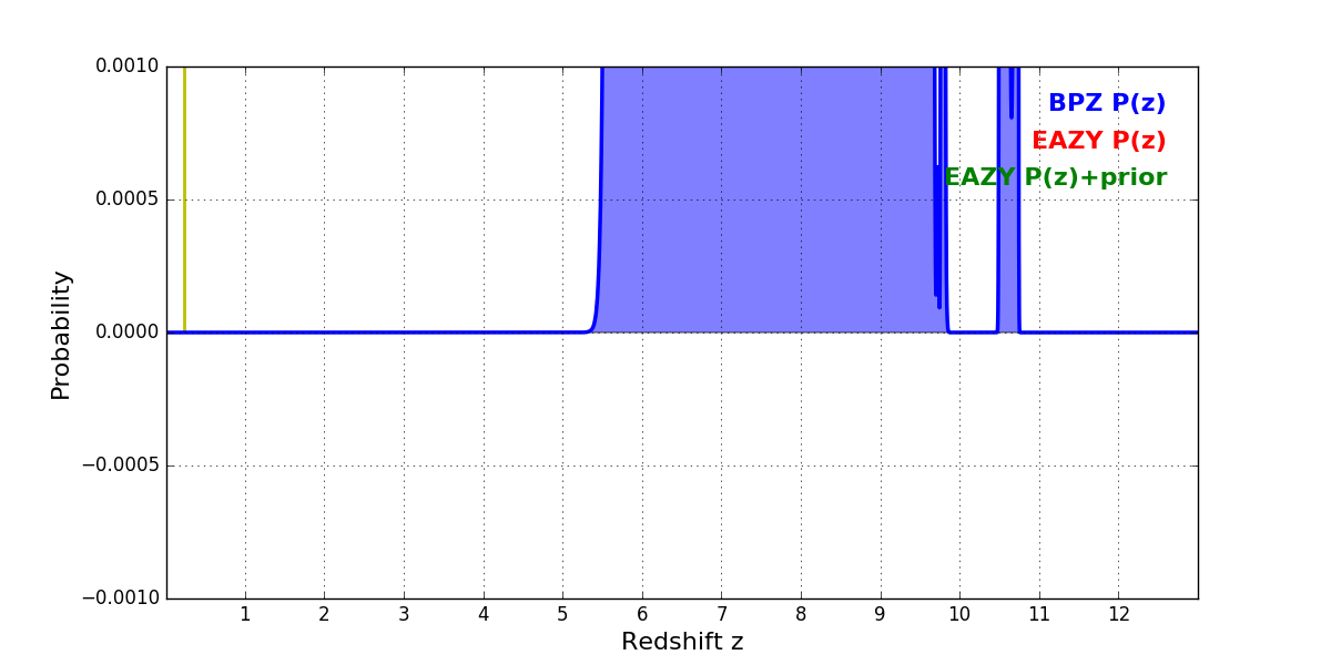 In P(z) plots: Yellow lines mark the cluster redshift z = 0.228,