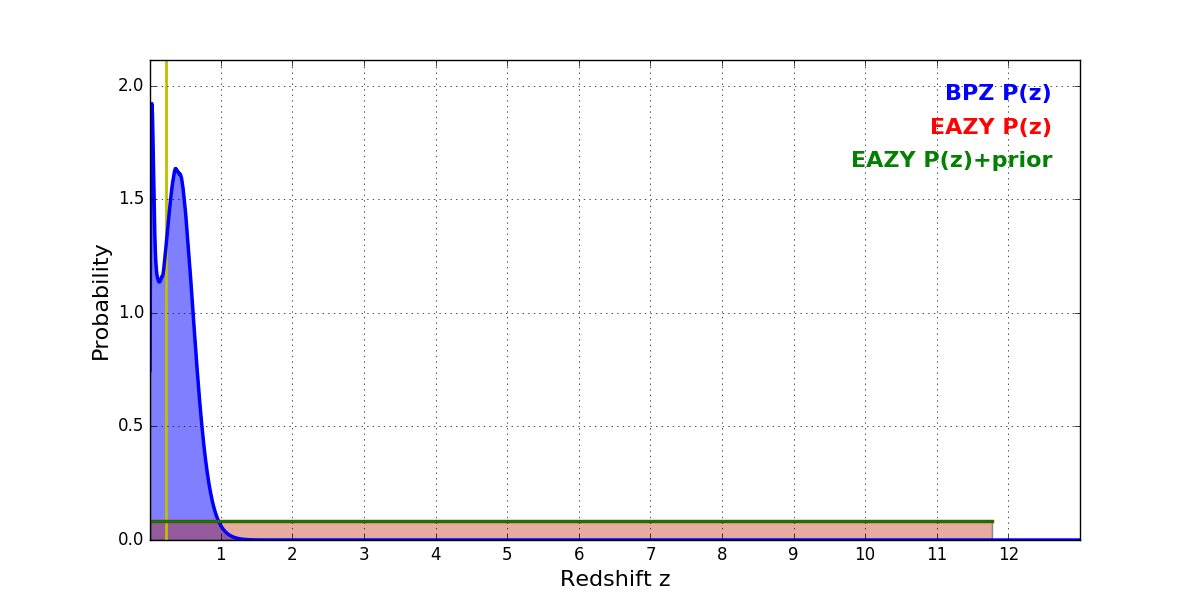 In P(z) plots: Yellow lines mark the cluster redshift z = 0.228,