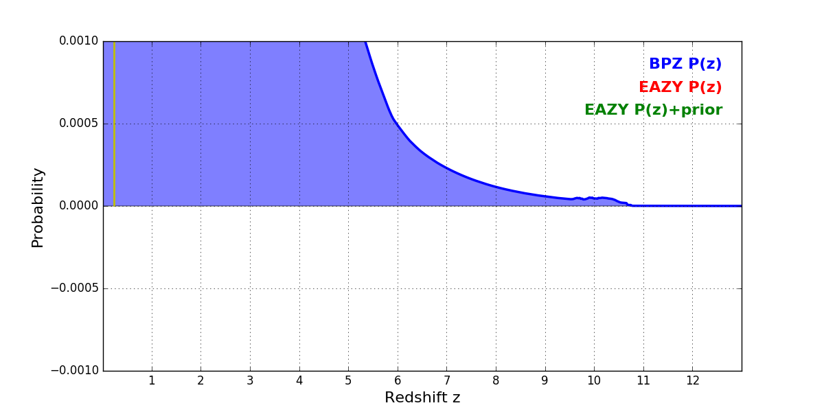 In P(z) plots: Yellow lines mark the cluster redshift z = 0.228,