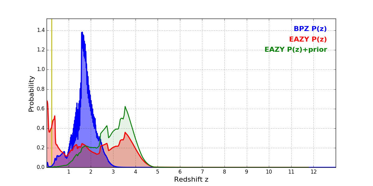 In P(z) plots: Yellow lines mark the cluster redshift z = 0.228,