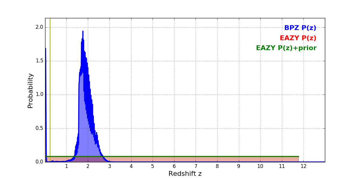 In P(z) plots: Yellow lines mark the cluster redshift z = 0.228,