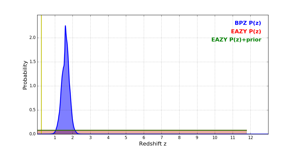 In P(z) plots: Yellow lines mark the cluster redshift z = 0.228,