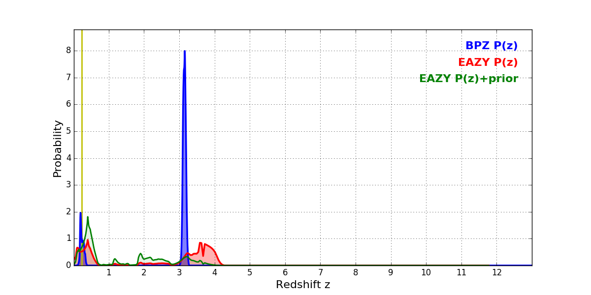 In P(z) plots: Yellow lines mark the cluster redshift z = 0.228,