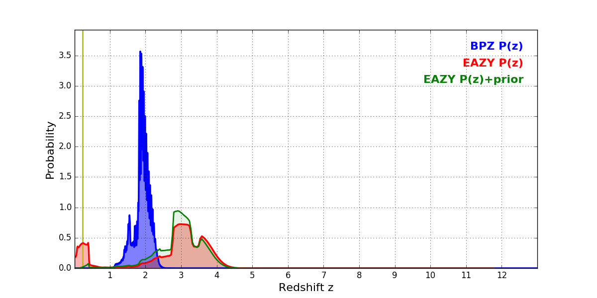 In P(z) plots: Yellow lines mark the cluster redshift z = 0.228,
