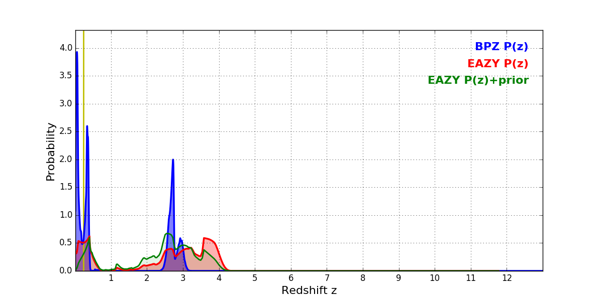 In P(z) plots: Yellow lines mark the cluster redshift z = 0.228,