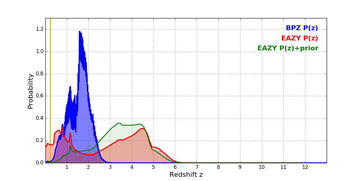 In P(z) plots: Yellow lines mark the cluster redshift z = 0.228,