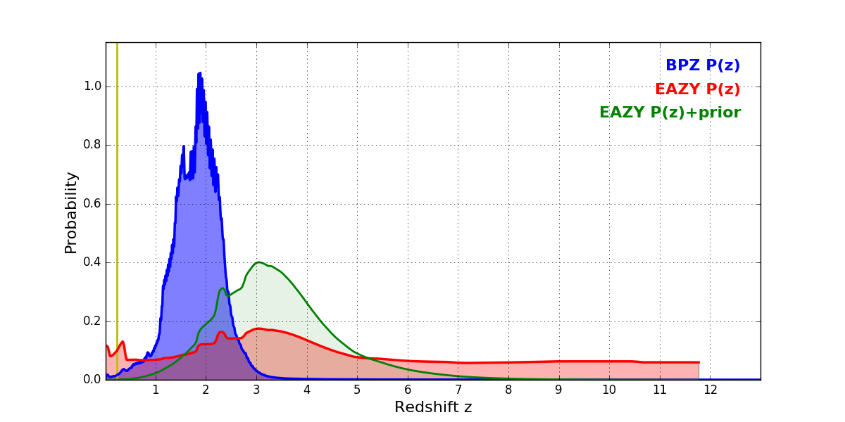 In P(z) plots: Yellow lines mark the cluster redshift z = 0.228,