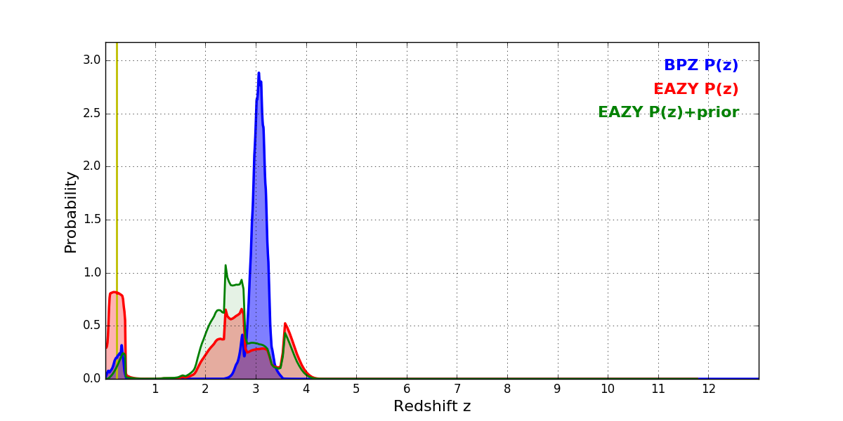 In P(z) plots: Yellow lines mark the cluster redshift z = 0.228,