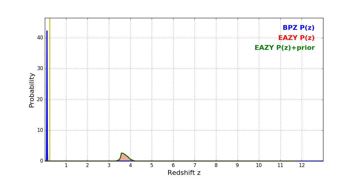 In P(z) plots: Yellow lines mark the cluster redshift z = 0.228,