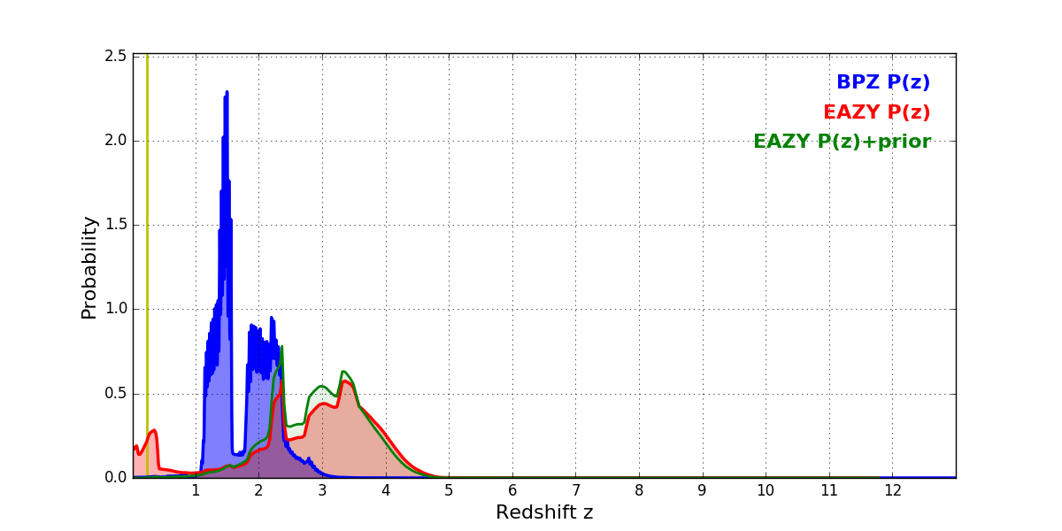 In P(z) plots: Yellow lines mark the cluster redshift z = 0.228,