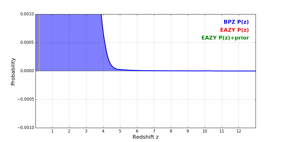 In P(z) plots: Yellow lines mark the cluster redshift z = 0.228,