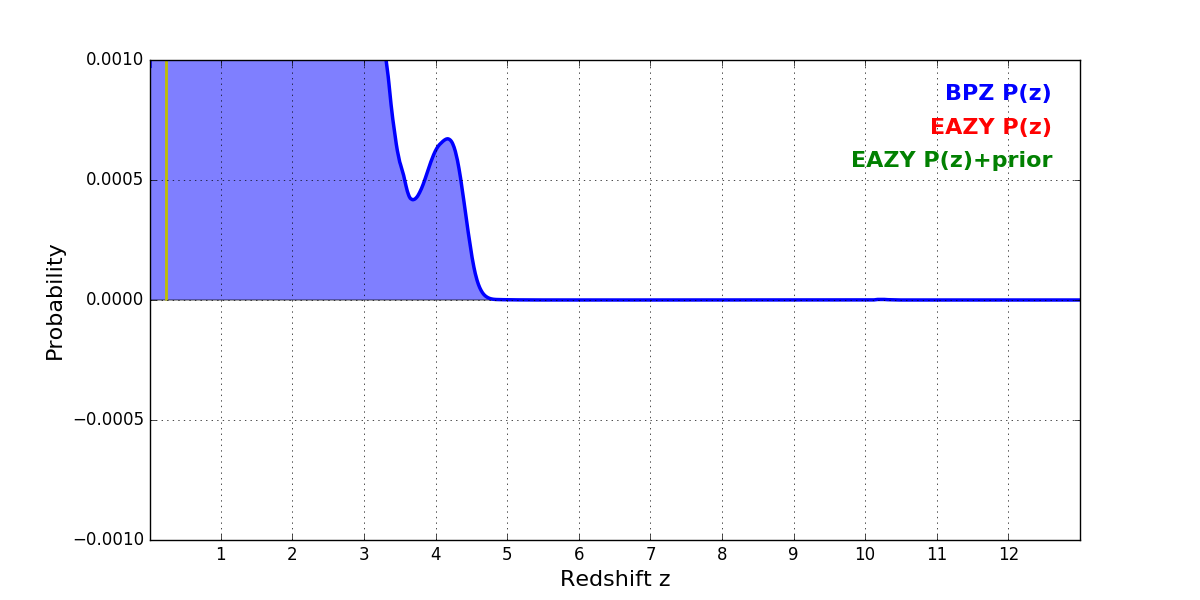 In P(z) plots: Yellow lines mark the cluster redshift z = 0.228,