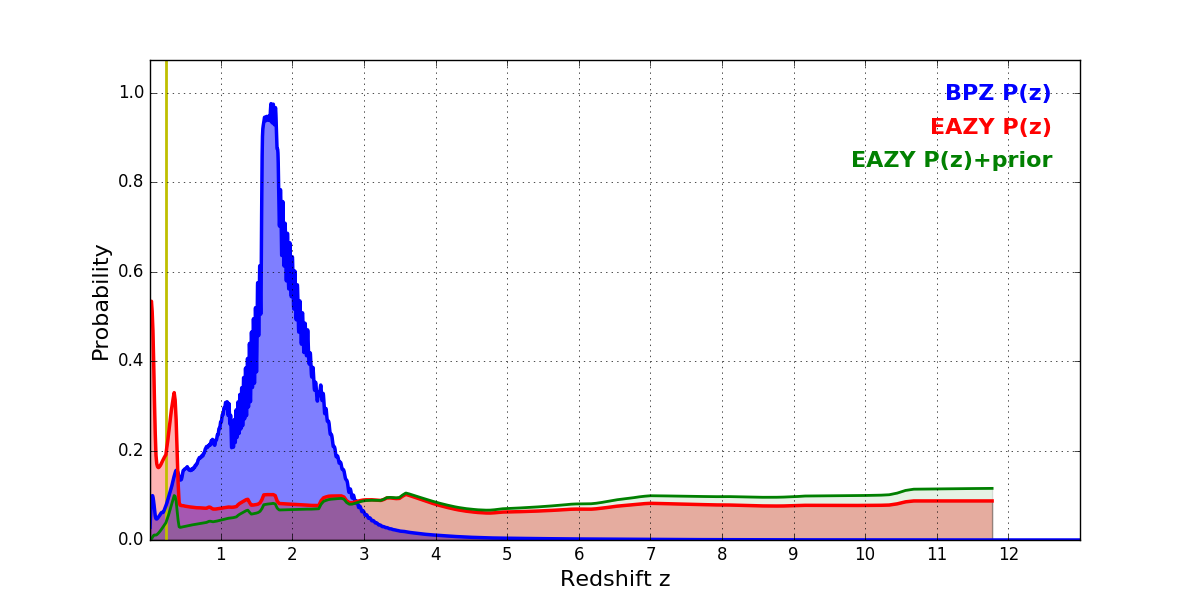 In P(z) plots: Yellow lines mark the cluster redshift z = 0.228,