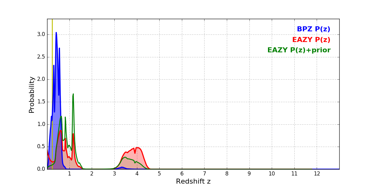 In P(z) plots: Yellow lines mark the cluster redshift z = 0.228,