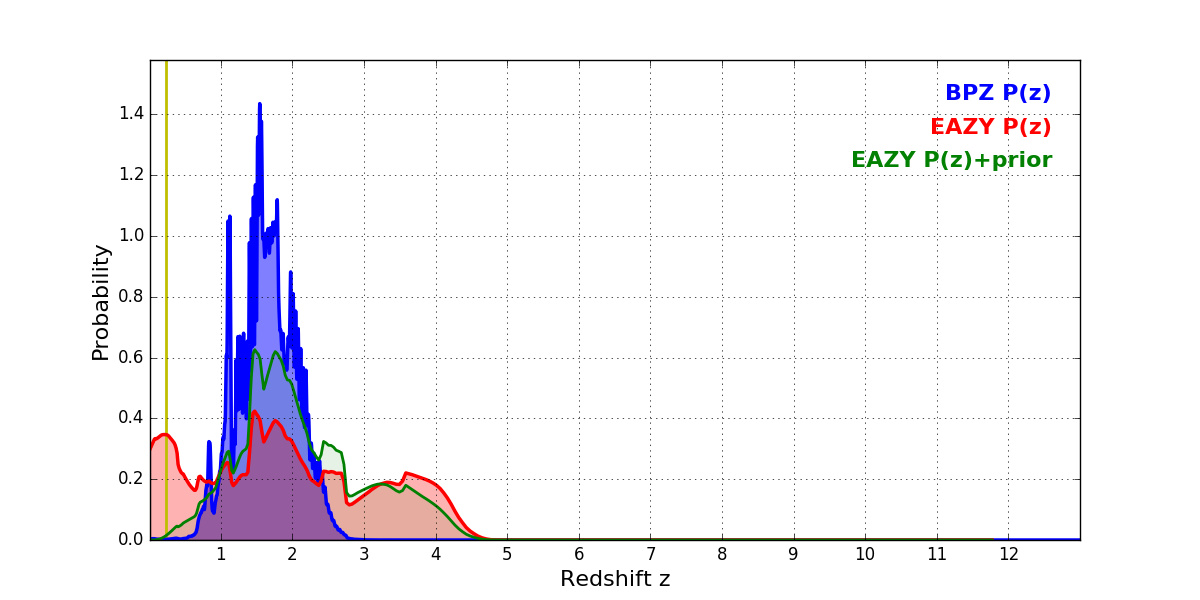 In P(z) plots: Yellow lines mark the cluster redshift z = 0.228,